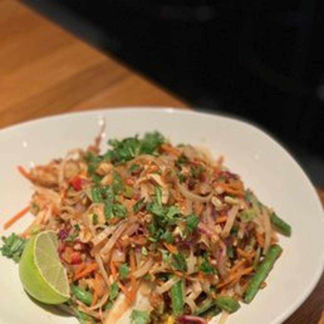 A classic Thai noodle dish featuring stir-fried rice noodles tossed with scrambled egg, bean sprouts, green onions, and crushed peanuts in a tangy and savory tamarind sauce. Typically prepared with tofu or chicken, offering a harmonious blend of sweet, sour, and umami flavors.