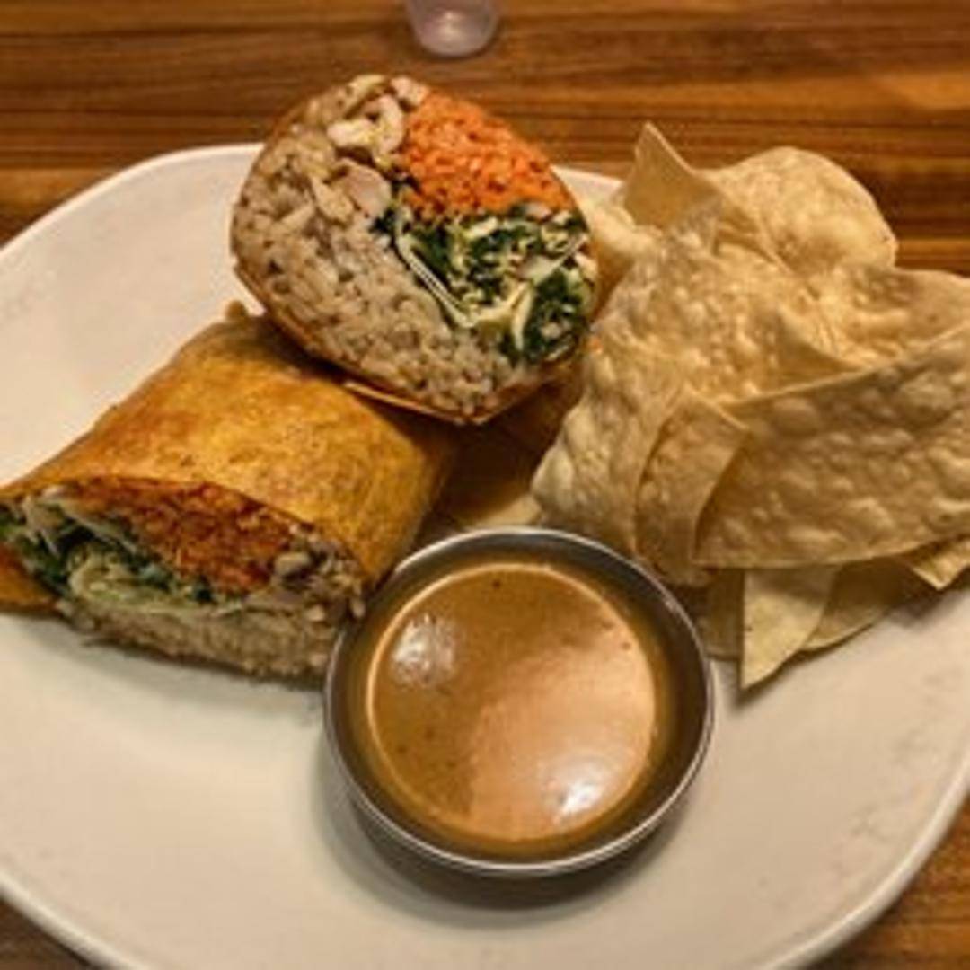 Experience a delightful fusion of flavors with the Thai Burrito. This unique offering takes the comforting format of a burrito and infuses it with the dynamic essence of Thai cuisine. Inside a warm tortilla, you'll discover a savory blend of organic brown rice, fresh-cut vegetables like crisp cabbage and carrots, aromatic cilantro, and often a choice of protein such as organic tofu or grilled chicken. The star of the show is typically a rich and creamy peanut sauce, along with a bright squeeze of lime, creating a portable, satisfying, and flavorful culinary adventure.