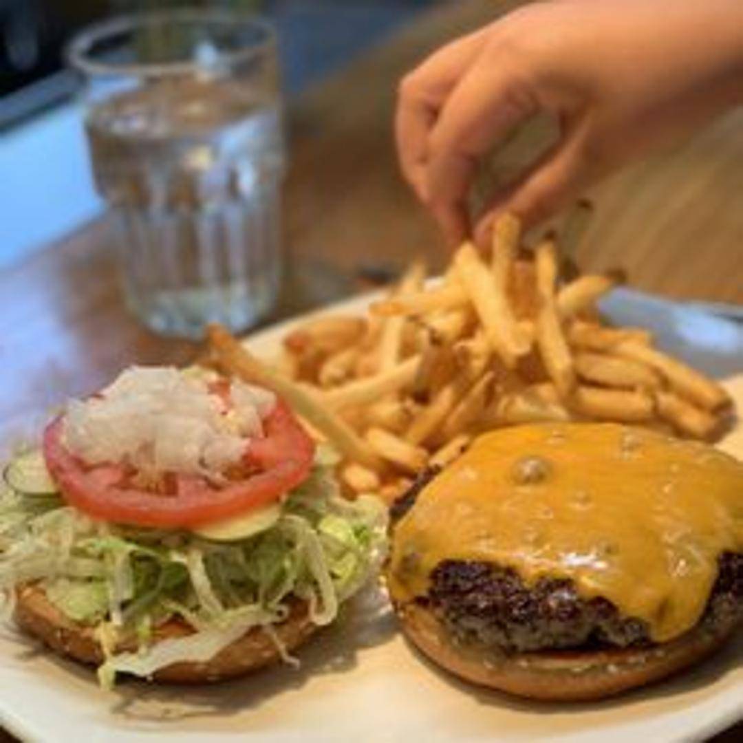 The quintessential American favorite, featuring a juicy, perfectly seared beef patty, generously topped with melted sharp cheddar or Swiss cheese, crisp lettuce, ripe tomato, thinly sliced red onion, and tangy pickles. All components are perfectly assembled on a toasted brioche bun, served with a side of classic condiments for that timeless flavor.