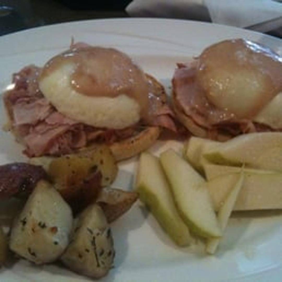 A delightful twist on two brunch classics! Grilled ham and Swiss cheese sandwich, dipped in an egg batter and griddled until golden brown. Topped with two poached eggs and a rich, creamy hollandaise sauce.