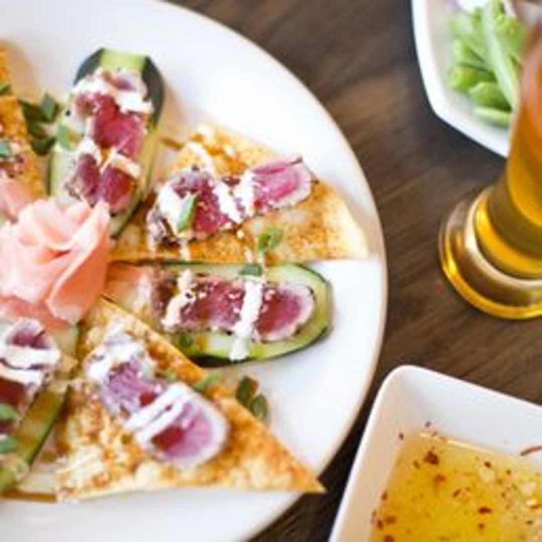 Seared rare Ahi tuna served on crispy wonton chips with avocado, seaweed salad, spicy mayo, and sesame seeds.