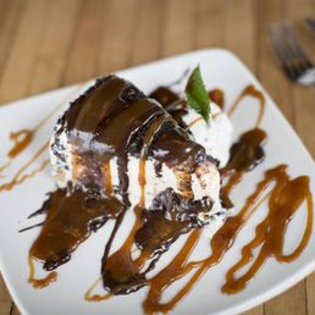 A decadent peanut butter mousse pie with an Oreo cookie crust, topped with chocolate sauce and whipped cream.