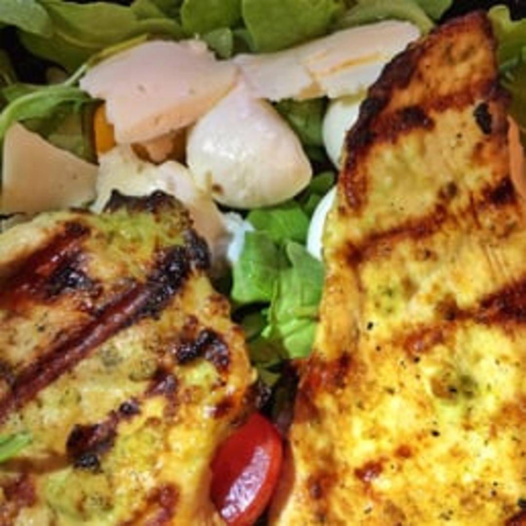 Grilled chicken breast topped with roasted red peppers, provolone cheese, pesto, and balsamic glaze on a grilled ciabatta roll. Served with french fries.