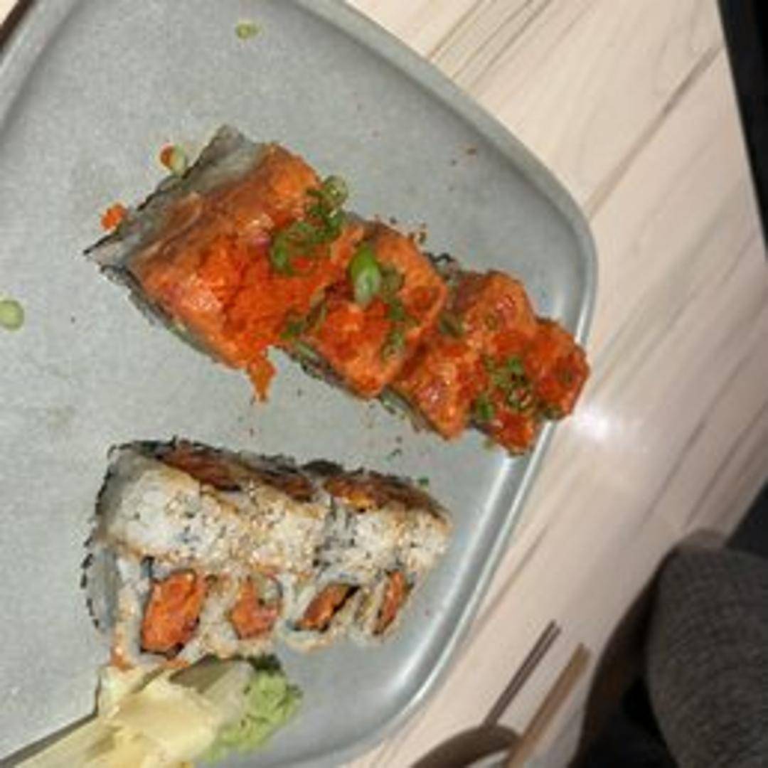 Tuna, avocado, spicy mayo, rolled in sushi rice and seaweed, topped with seared tuna, eel sauce, and spicy mayo.