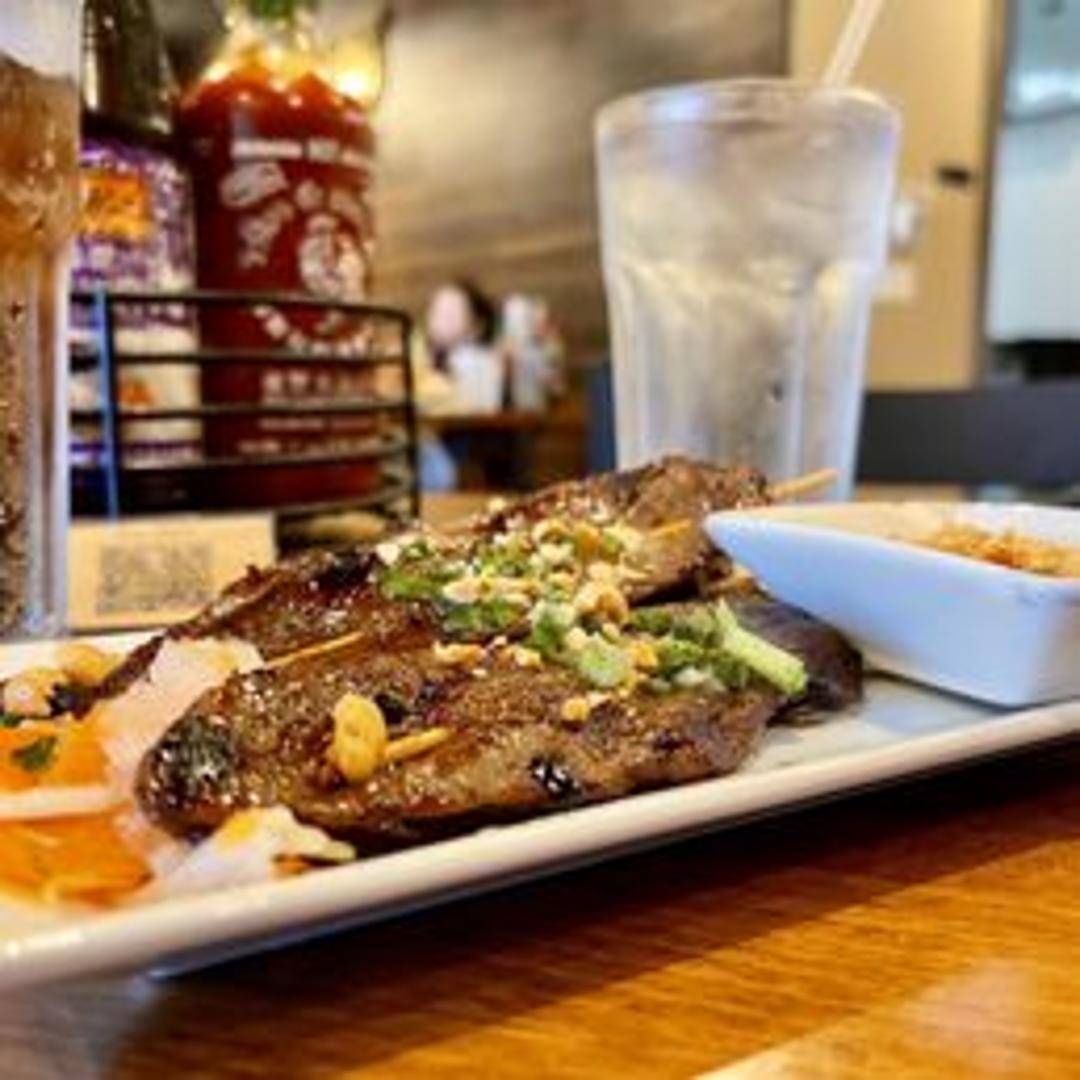 Three skewers of grilled beef marinated in a flavorful satay sauce. Served with a side of peanut sauce for dipping.