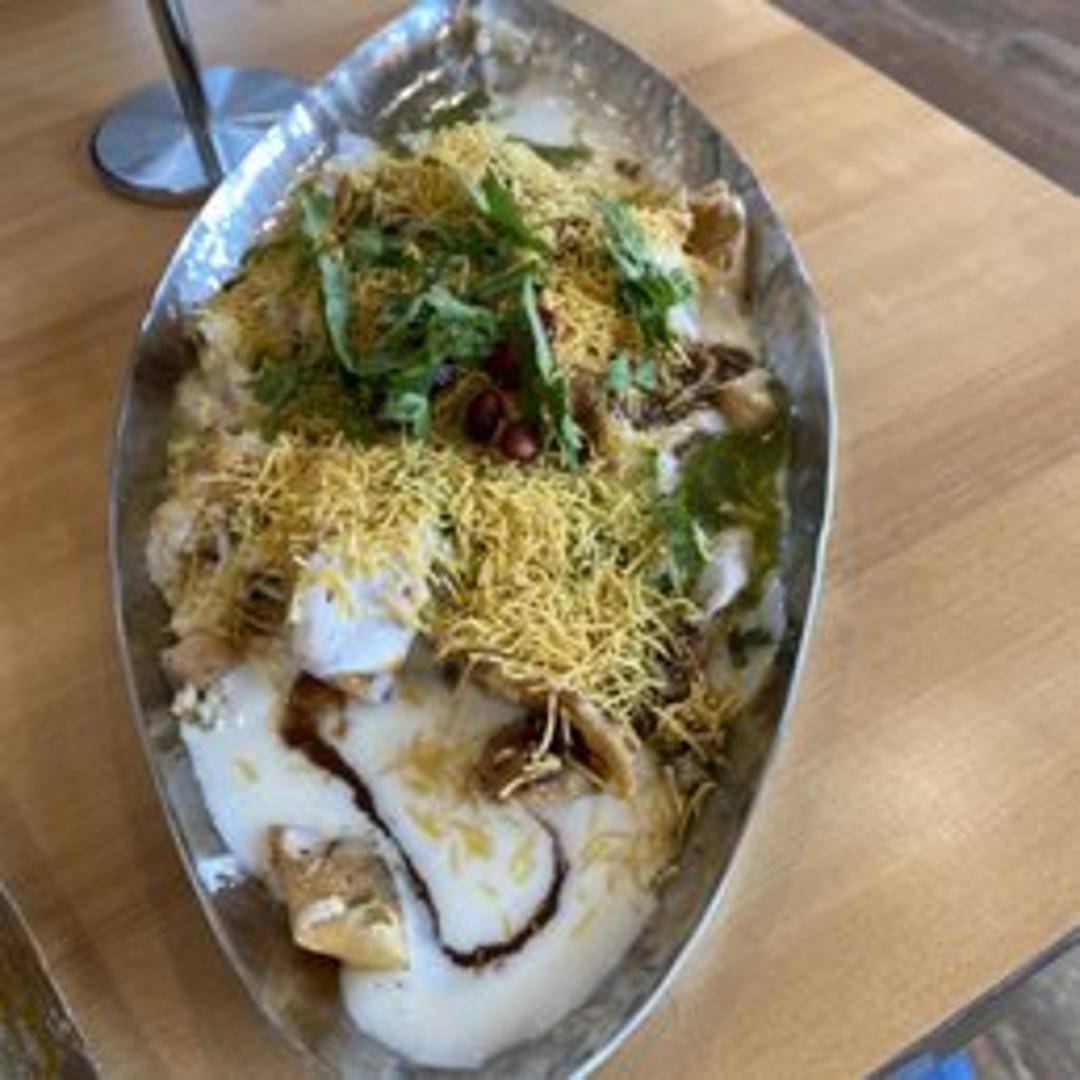 Crispy papri (fried dough wafers) topped with boiled potatoes, chickpeas, yogurt, and a medley of chutneys: tamarind, mint-coriander, and often a touch of spicy chili chutney. Sprinkled with sev, onions, and cilantro for added texture and flavor.