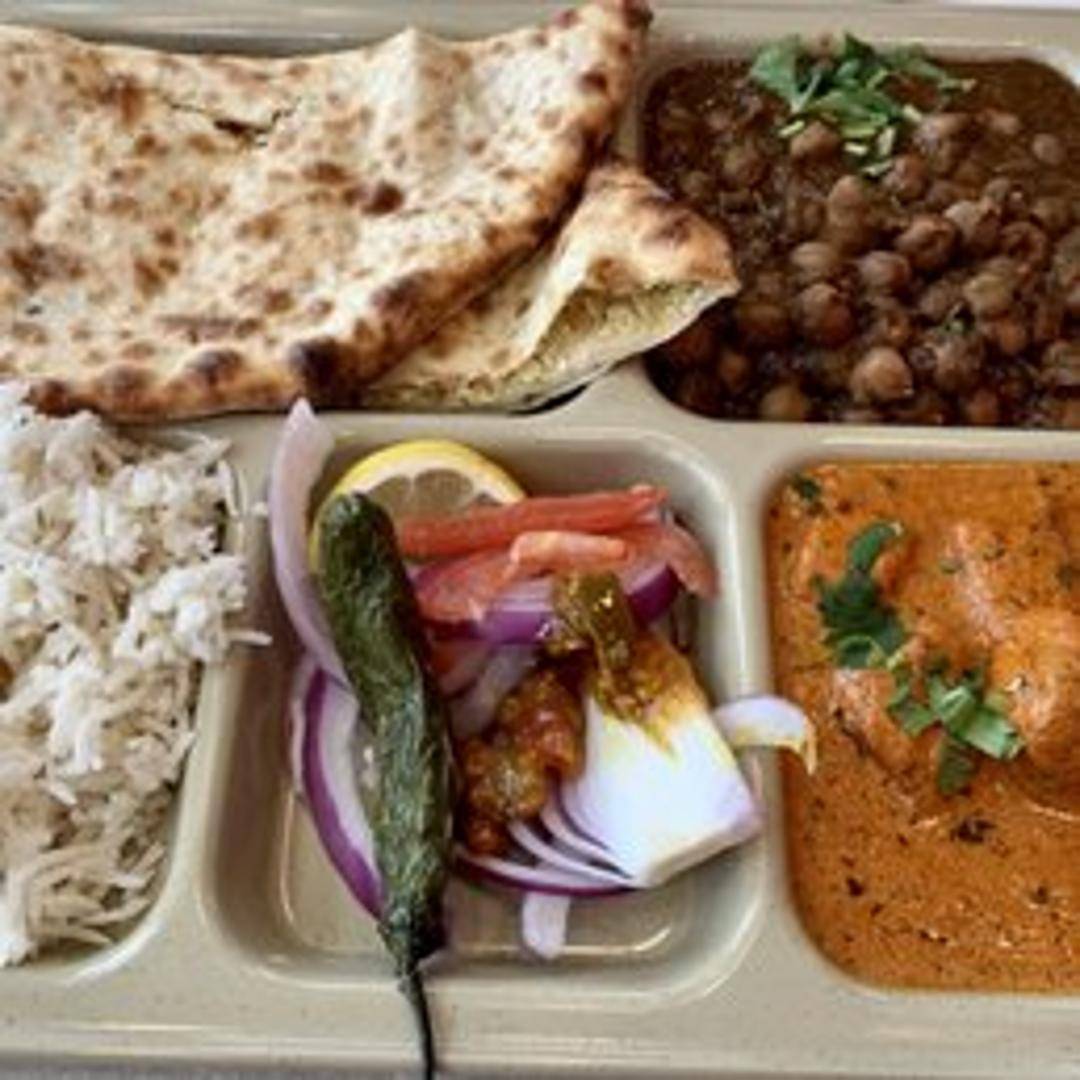 A traditional North Indian meal featuring Amritsari Kulcha, a flaky, leavened flatbread stuffed with spiced potatoes and baked in a tandoor oven. Accompanied by Chole, a flavorful chickpea curry cooked with onions, tomatoes, and a blend of Indian spices. Served with pickled onions and chutney.