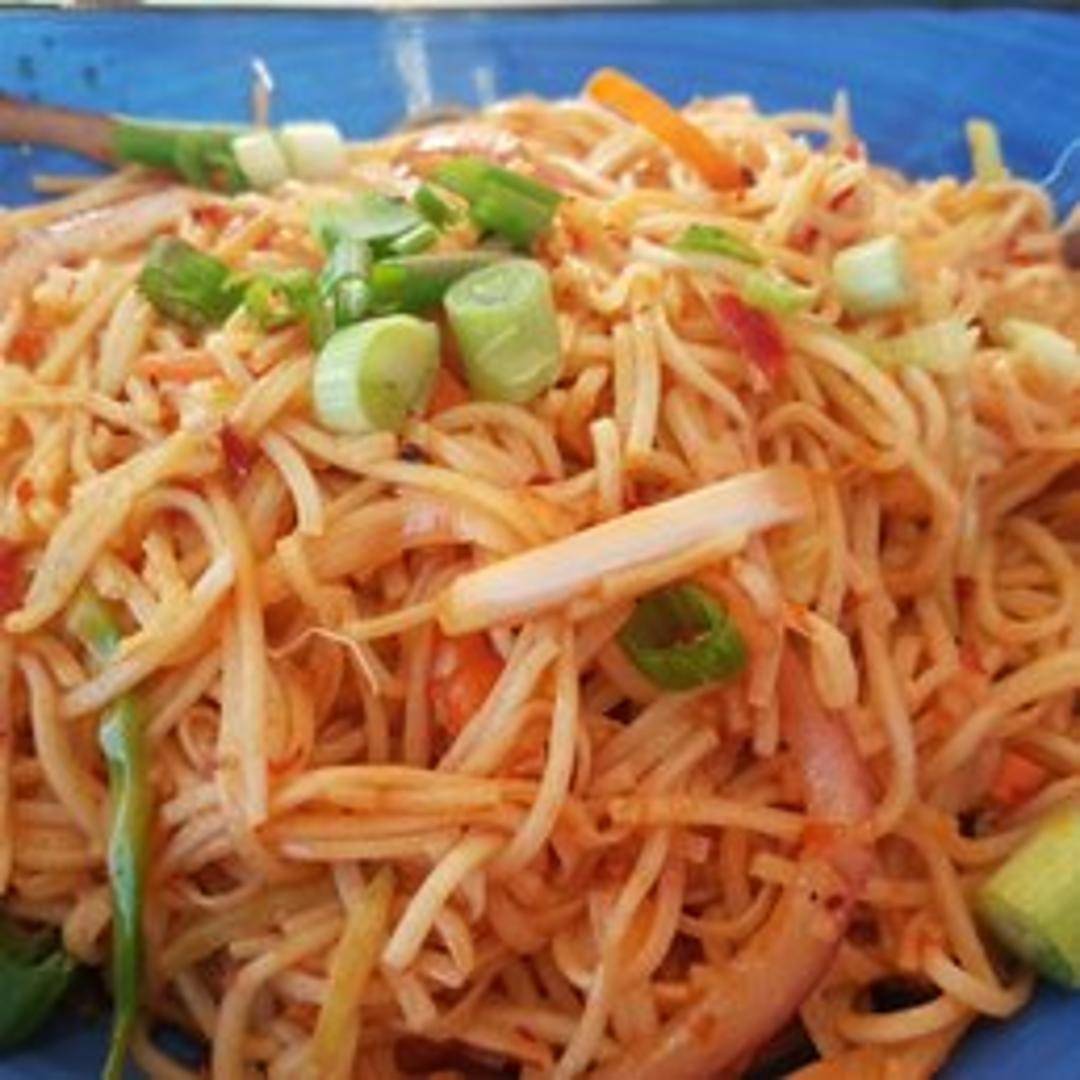 A flavorful Indo-Chinese noodle dish stir-fried with a generous amount of garlic, chili peppers, and other vegetables. The noodles are coated in a savory and spicy sauce, offering a satisfying and aromatic experience.