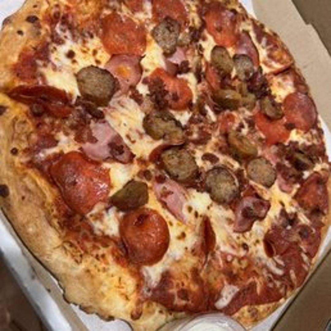 A hearty pizza piled high with pepperoni, sausage, bacon, and ground beef on our signature NY style crust with traditional tomato sauce and mozzarella cheese.
