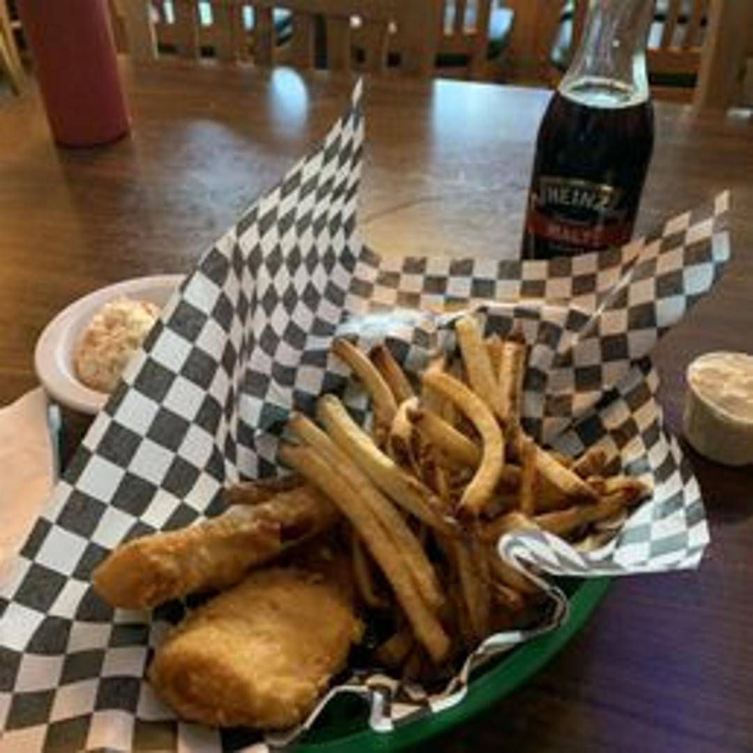 Crispy, beer-battered cod fillets served with a generous portion of golden-fried chips (french fries). Includes tartar sauce and malt vinegar.