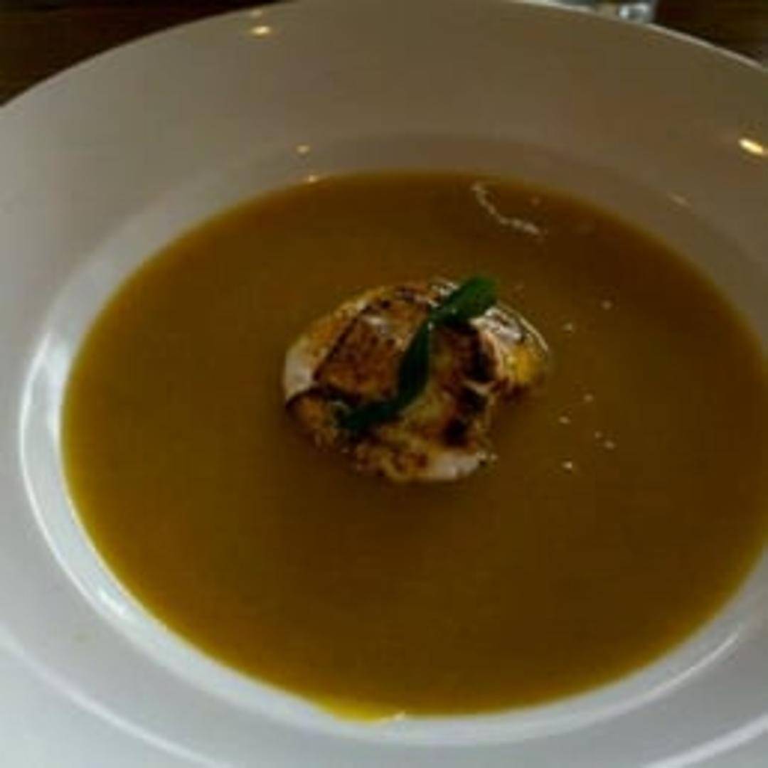 A creamy and comforting soup made from roasted butternut squash. The roasting process caramelizes the squash, enhancing its natural sweetness. The soup is likely seasoned with spices and herbs and may be garnished with toasted seeds, a swirl of cream, or croutons.