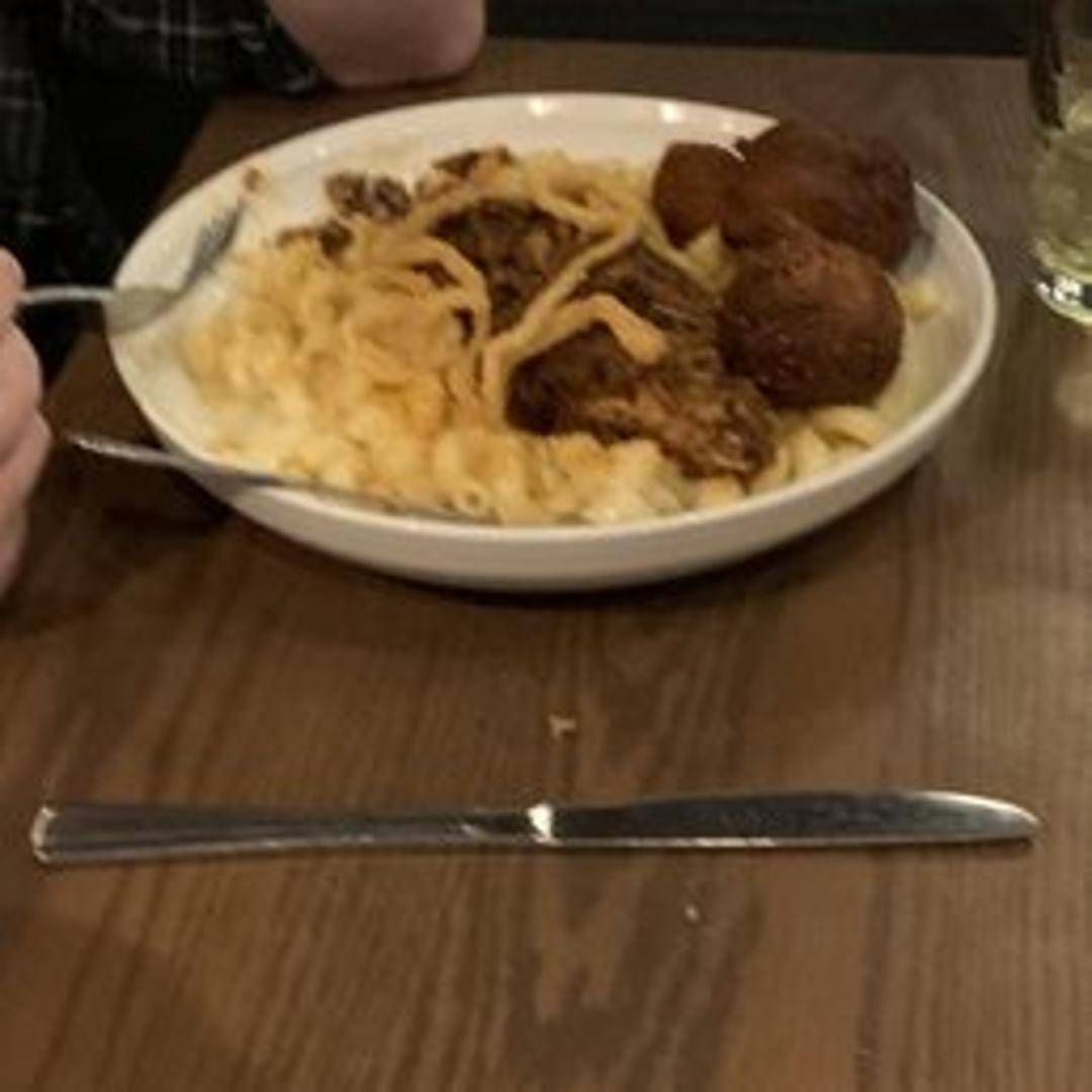 Creamy mac and cheese topped with tender, slow-cooked BBQ pulled pork. A rich and savory combination.