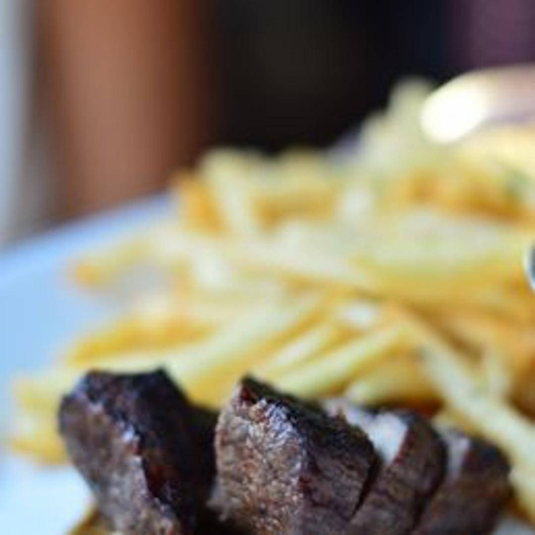 A quintessential bistro classic, showcasing a perfectly seared premium steak, expertly cooked to your preferred doneness, accompanied by a generous portion of golden, crispy frites. This dish celebrates the superb quality of the beef, offering a satisfying and flavorful experience with every bite.