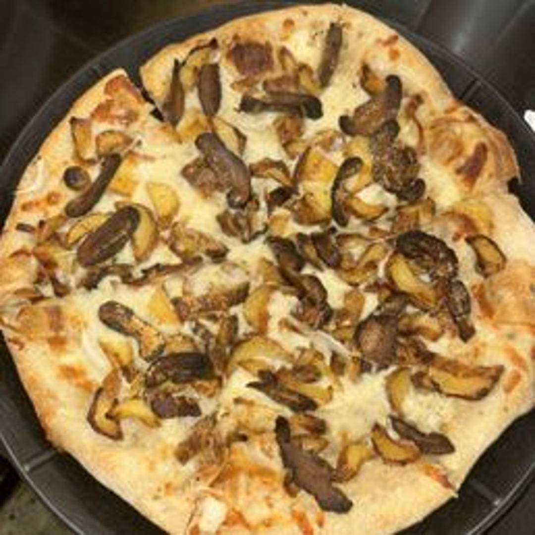 Thin-crust pizza topped with thinly sliced potatoes, savory herbs, melted cheese, and a drizzle of olive oil. A unique and flavorful pizza experience.