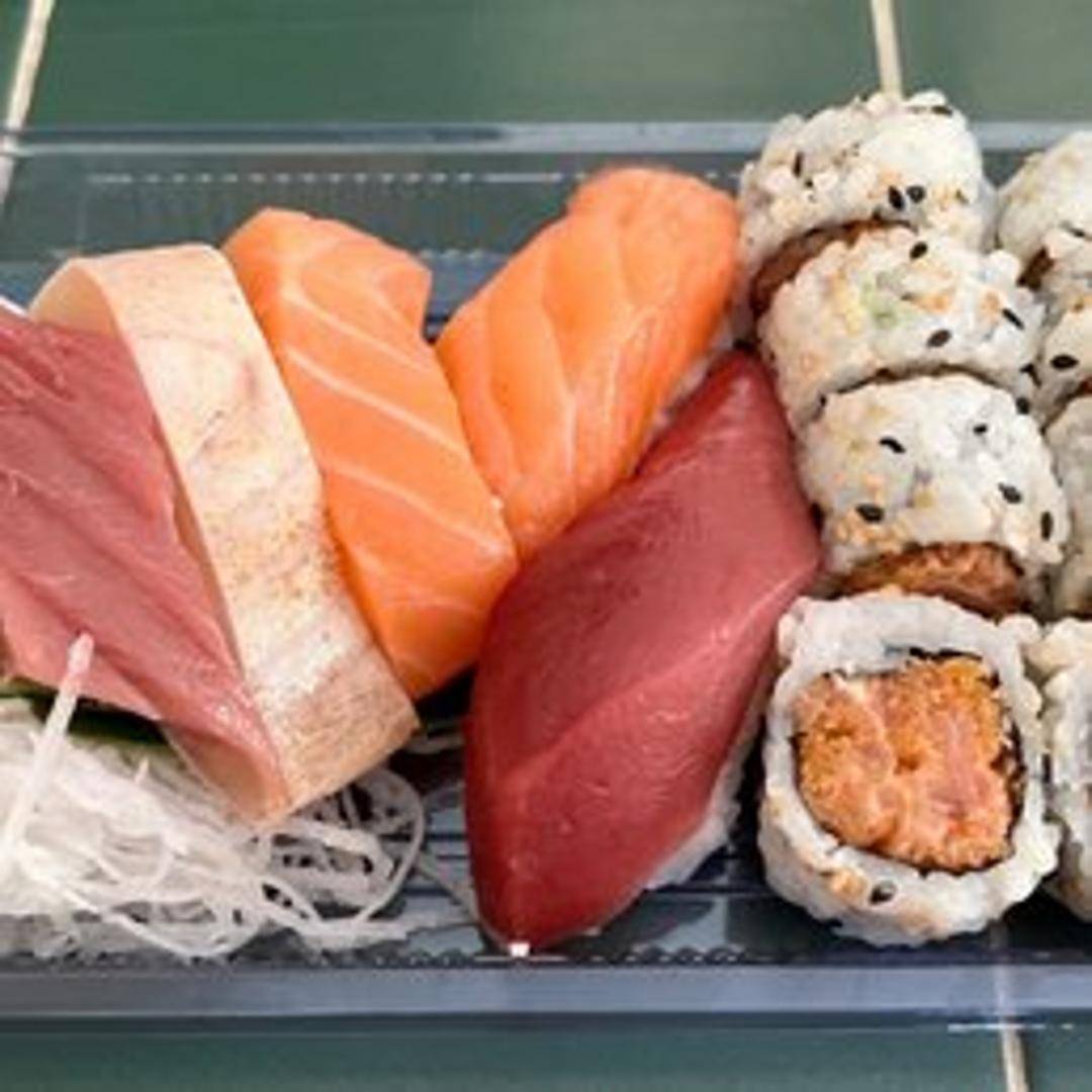 An assortment of thinly sliced, fresh raw fish, including tuna, salmon, and white fish. Served with soy sauce, wasabi, and a garnish of shredded daikon radish.