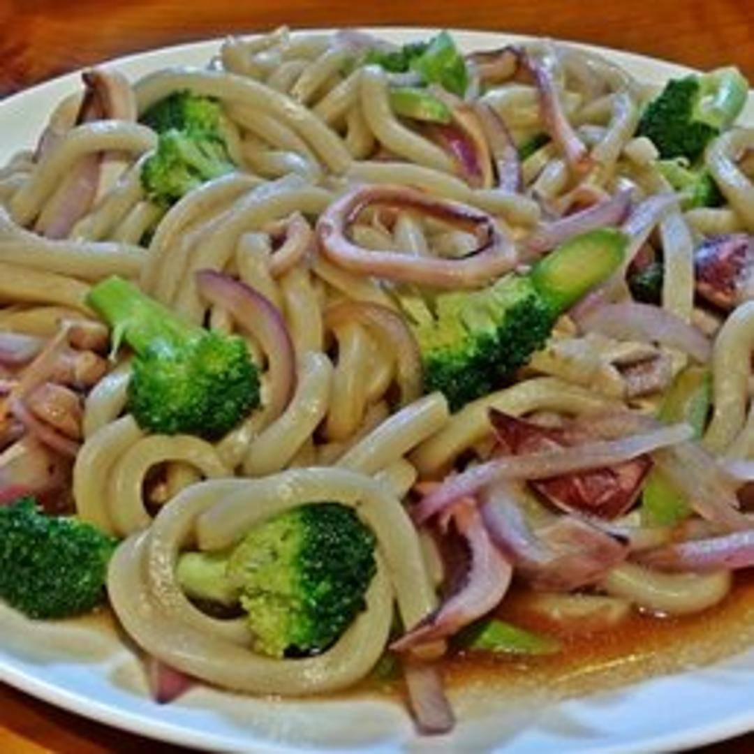Stir-fried thick udon noodles with thinly sliced beef, vegetables (such as cabbage, carrots, and onions), and a savory Japanese sauce. Garnished with sesame seeds.