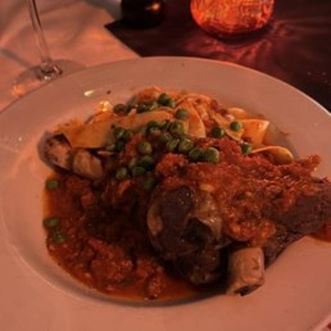 Braised lamb shank in a rich red wine sauce, served with creamy polenta or mashed potatoes.
