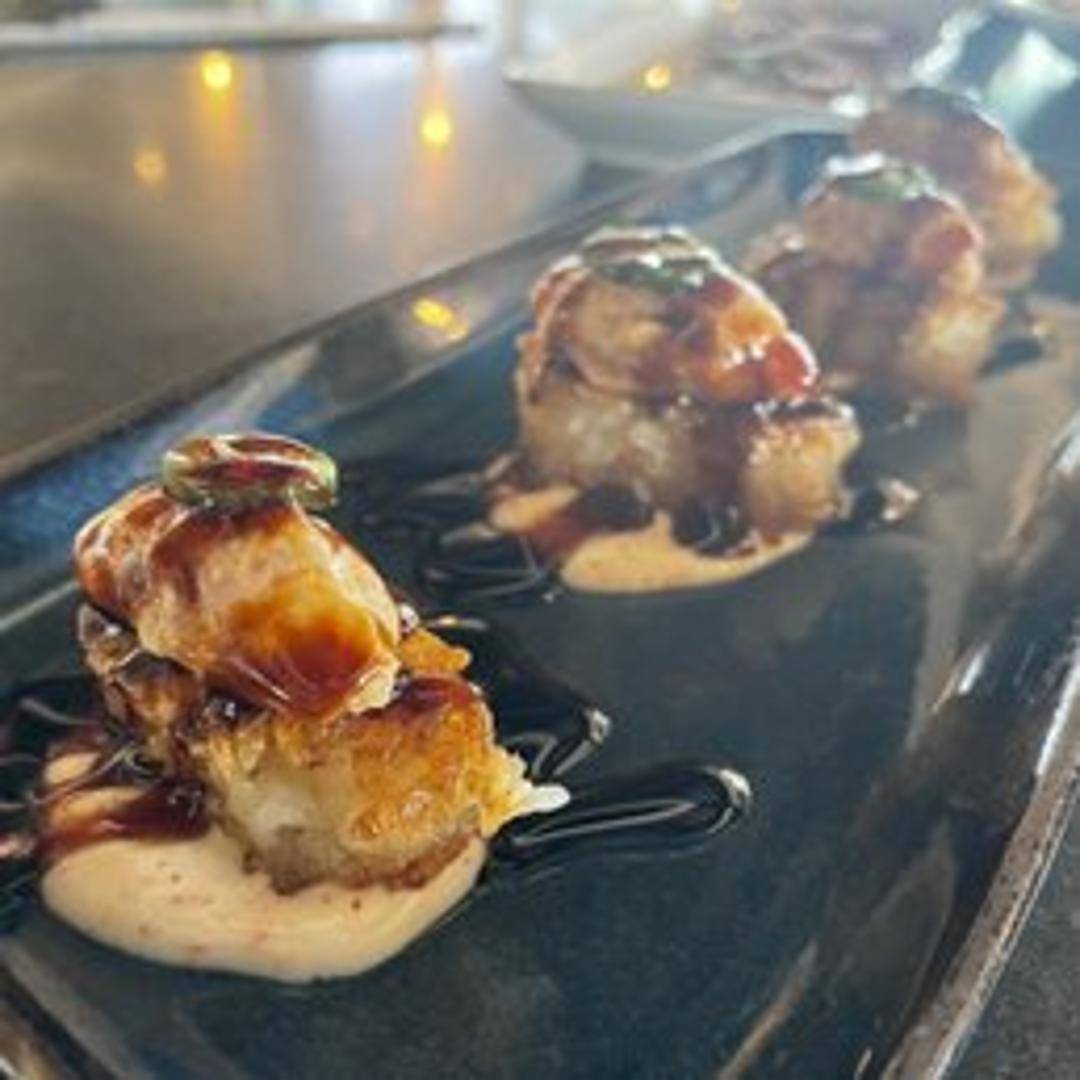 Crispy rice cakes topped with spicy tuna, avocado, and a drizzle of savory sauce.