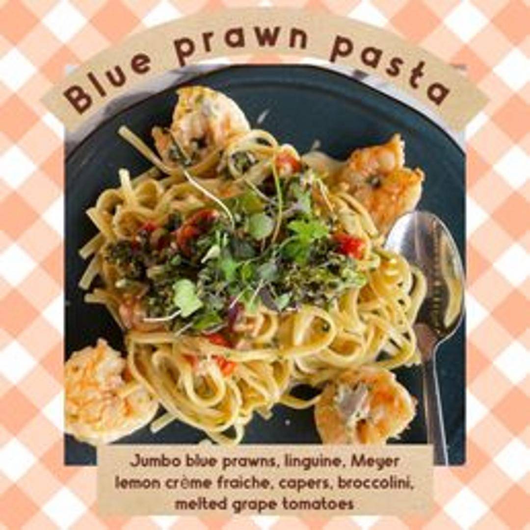 Pasta dish with succulent blue prawns, tossed in a flavorful sauce.