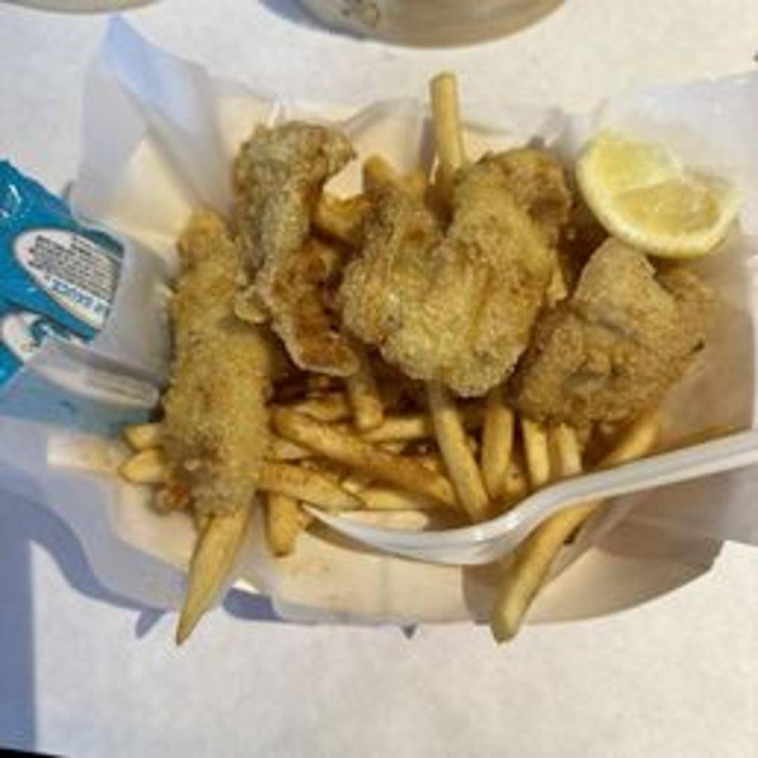 A generous basket filled with crispy, golden-fried fish fillets served alongside a mountain of perfectly cooked french fries. A classic and satisfying meal.