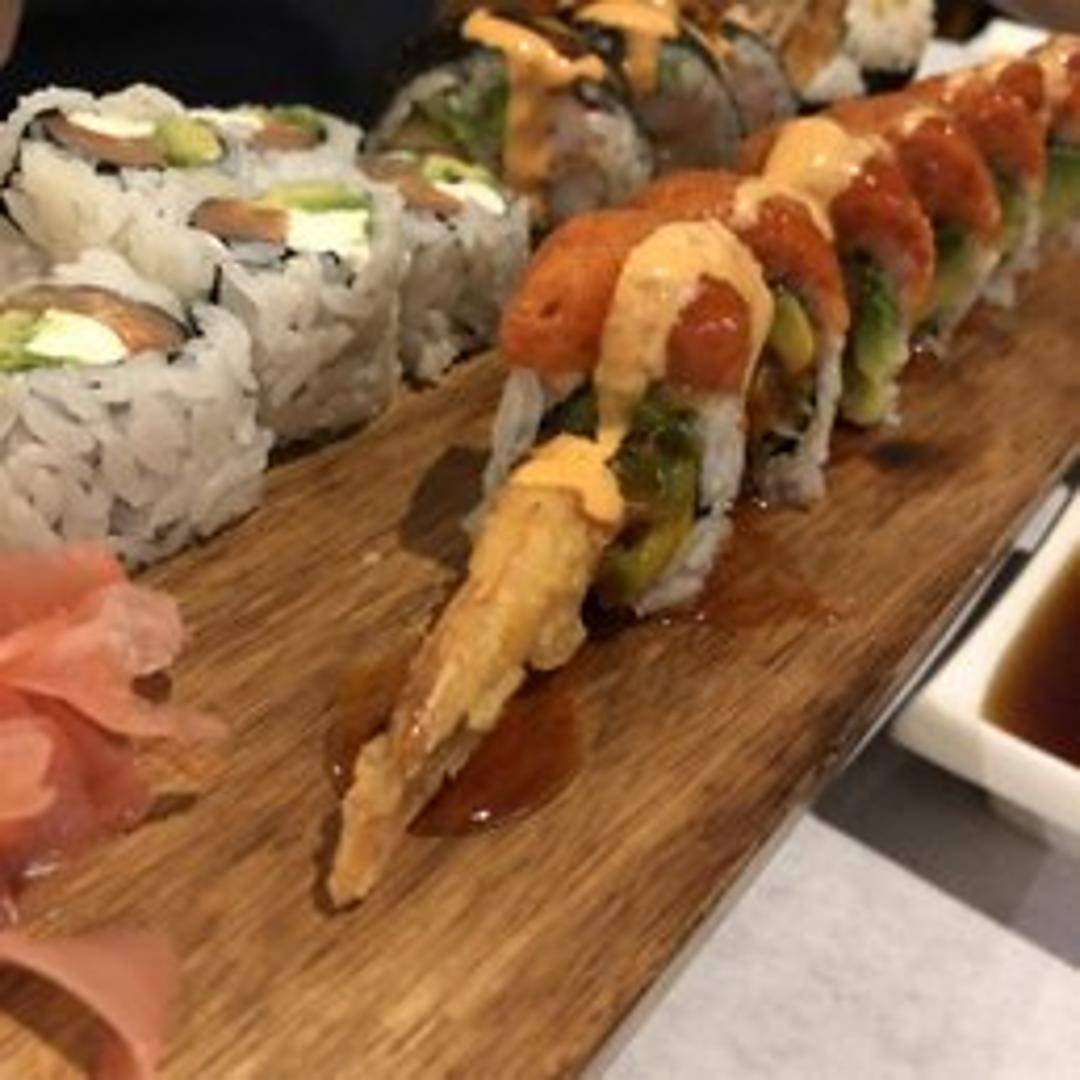 The beloved Dragon Roll is a culinary masterpiece, featuring a core of tender eel and crisp cucumber. It's elegantly crowned with thin, overlapping slices of fresh avocado, creating a striking visual, and finished with a rich drizzle of sweet eel sauce.