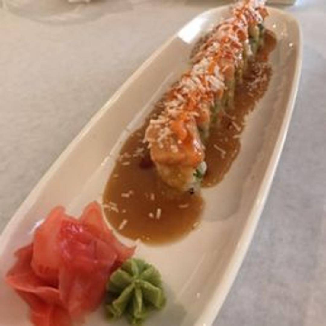 A signature specialty roll featuring crispy shrimp tempura, creamy avocado, and fresh cucumber, all expertly rolled and topped with a delicate layer of spicy tuna and a special sweet chili aioli, creating a harmonious blend of textures and tastes.