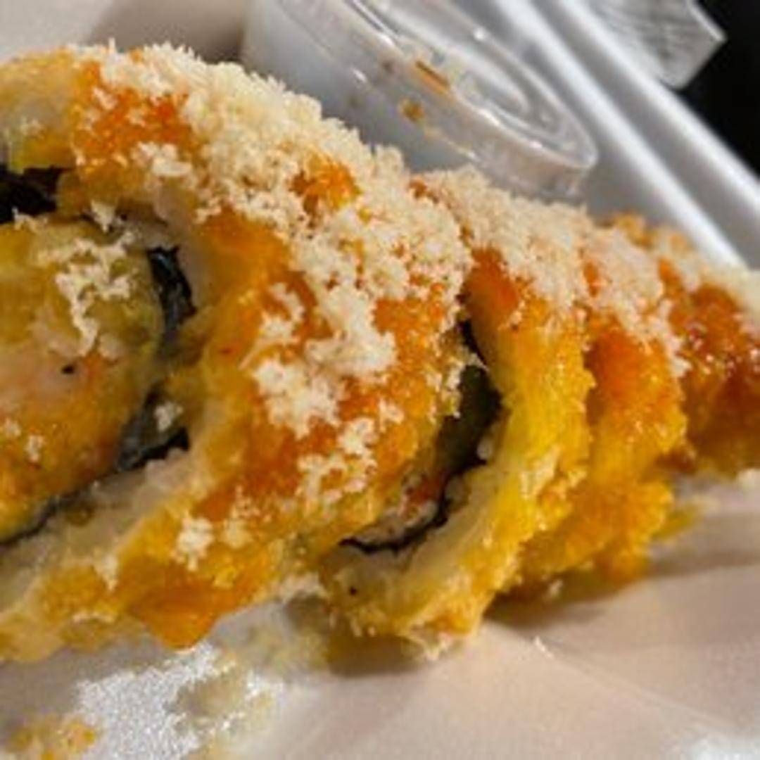 A sushi roll filled with crispy, lightly battered shrimp tempura, typically combined with avocado, cucumber, and mayonnaise or a similar sauce. Often wrapped in seaweed and rice, and topped with sesame seeds.