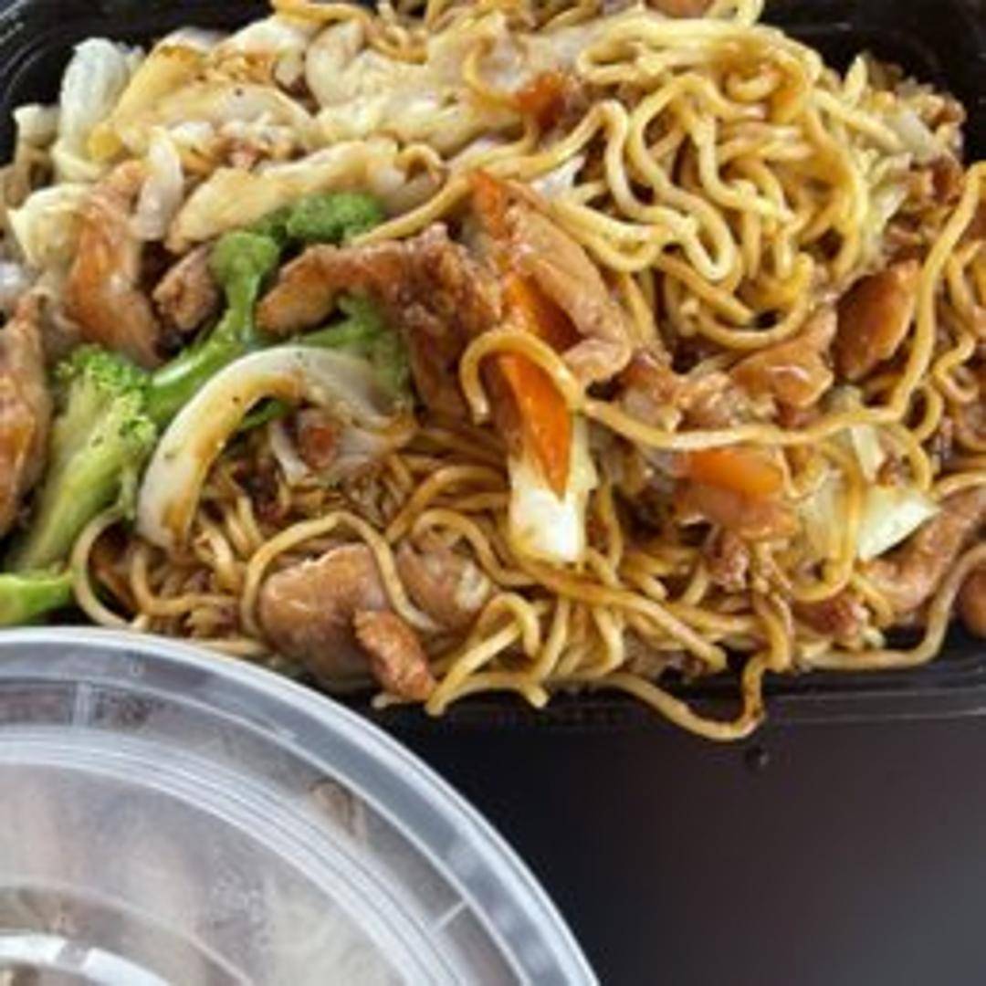 Stir-fried wheat noodles with tender pieces of chicken, mixed vegetables such as cabbage, carrots, and celery, seasoned with soy sauce and savory Asian sauces.