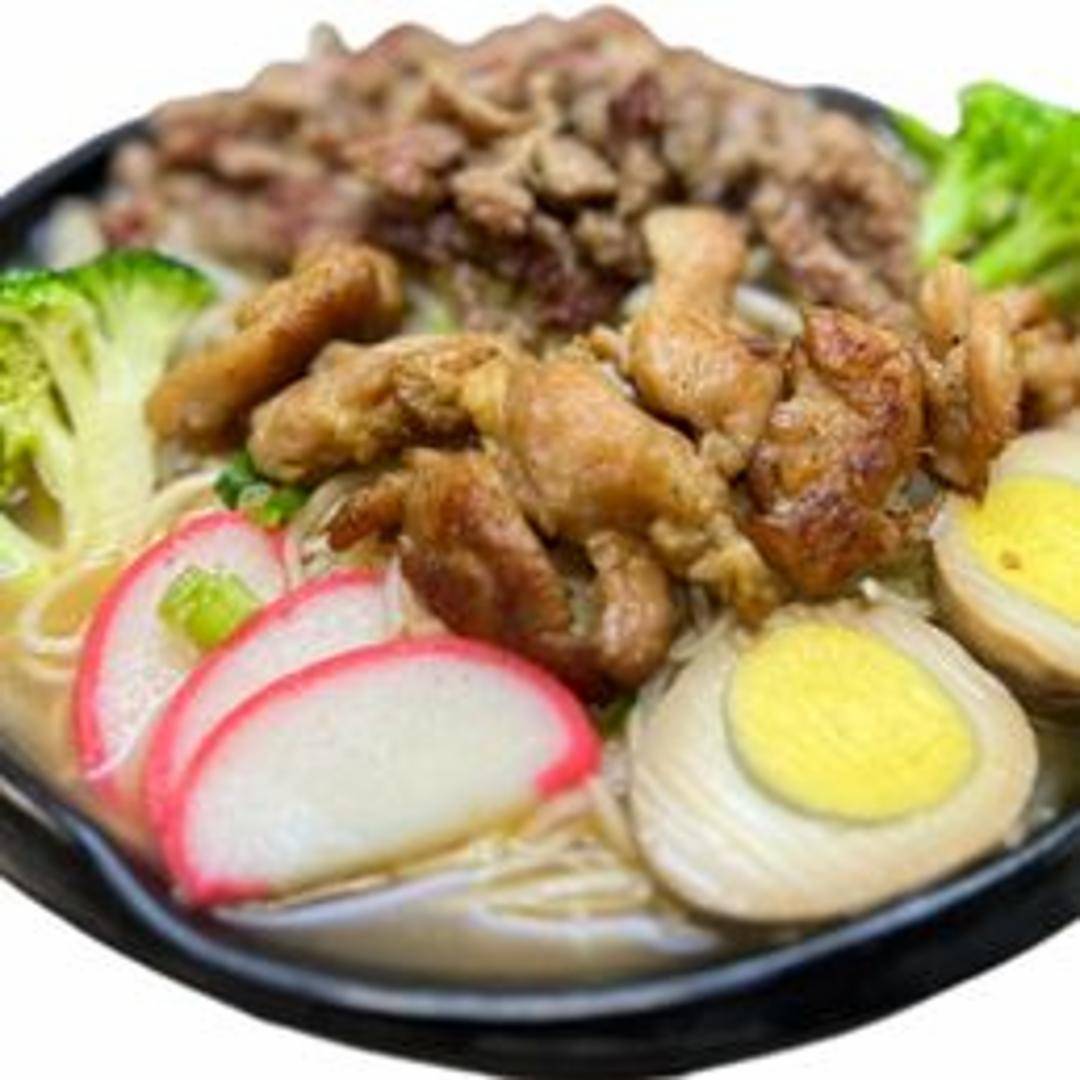 A comforting Japanese noodle soup featuring wheat noodles in a savory broth with tender slices of beef. Garnished with traditional toppings such as seaweed, green onions, and boiled egg. (Please note, specific toppings may vary.)