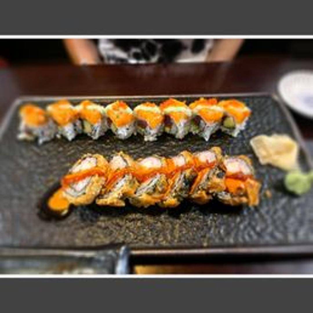 Eel and cucumber roll topped with avocado and eel sauce.