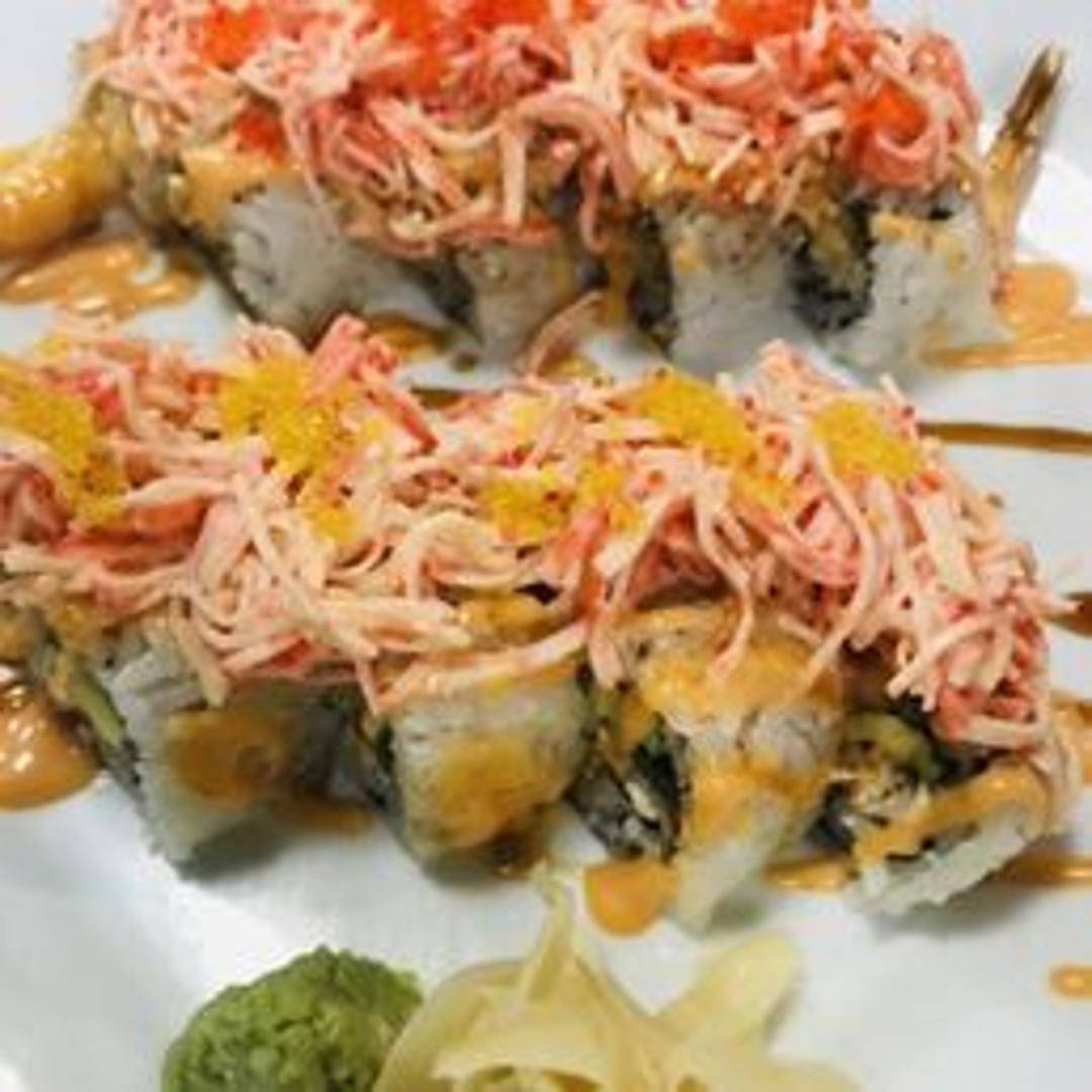 A delicious sushi roll featuring spicy tuna and avocado inside, topped with seared tuna, eel sauce, and spicy mayo.