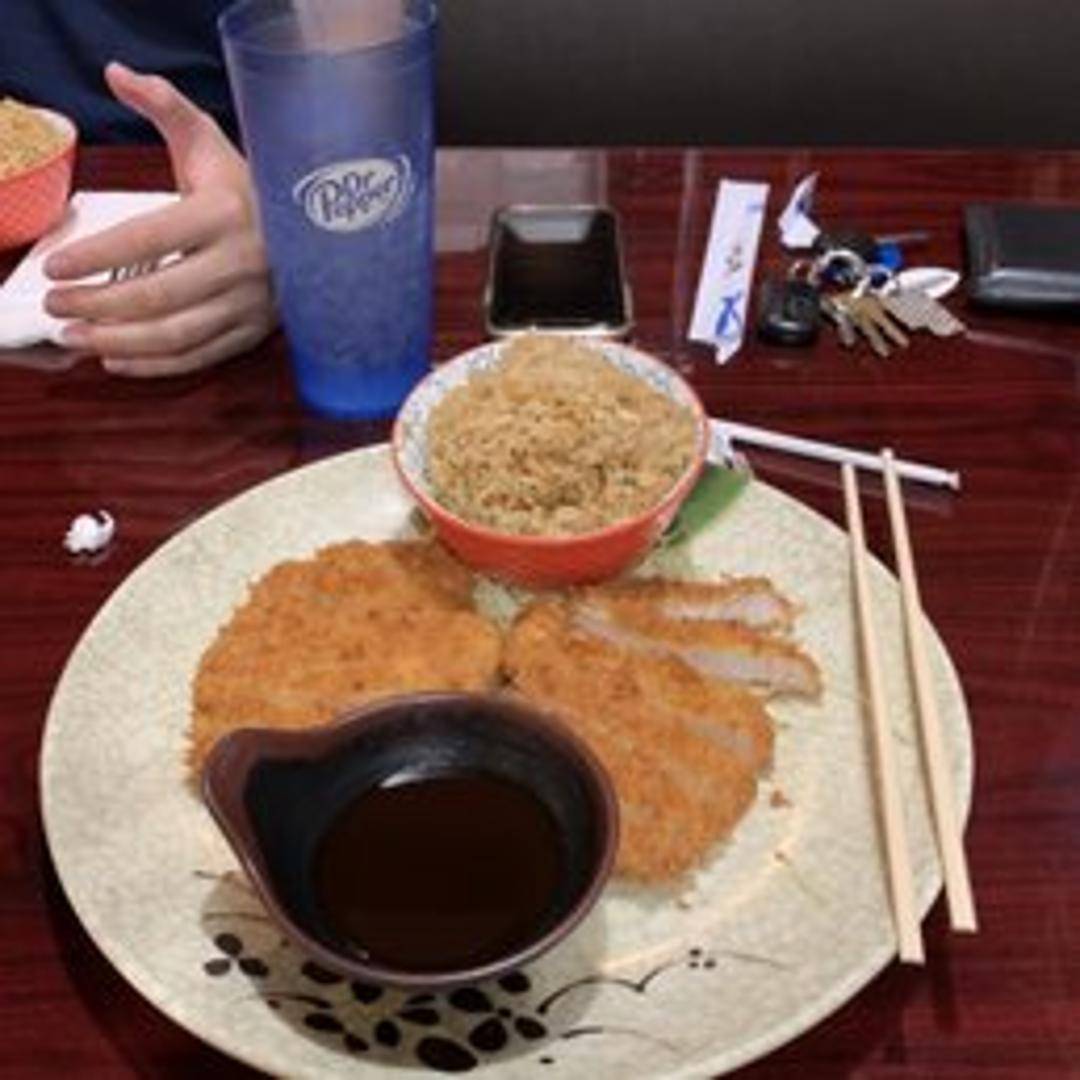 Crispy, deep-fried breaded pork cutlet. Served with tonkatsu sauce. Includes a side of rice and a side salad with ginger dressing.