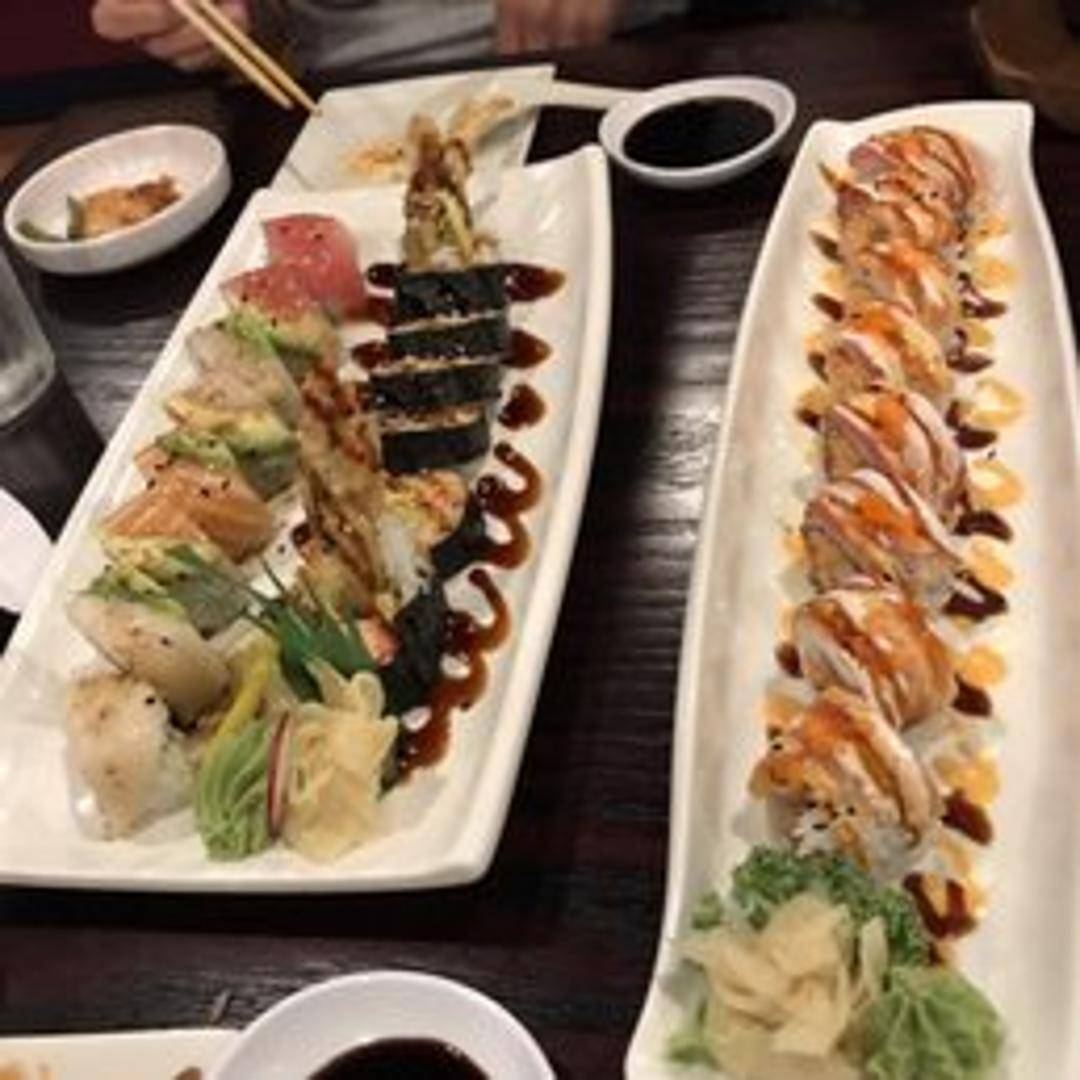 A vibrant and artfully presented sushi roll featuring an inner core of krab stick and avocado, delicately topped with an array of thinly sliced fresh fish such as tuna, salmon, and yellowtail, creating a colorful 'rainbow' effect. Finished with a touch of tobiko and a drizzle of special sauce, offering a delightful blend of textures and fresh flavors.