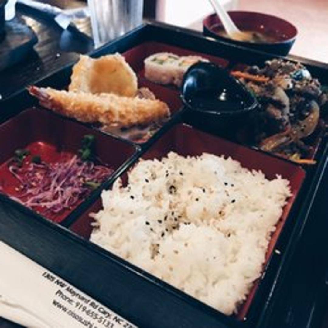 A traditional Japanese-style complete meal served in a compartmented box. Each Bento Box is thoughtfully assembled to offer a balanced and diverse culinary experience, typically including a main protein choice (such as teriyaki chicken, bulgogi, or crispy tempura), alongside steamed rice, fresh salad with ginger dressing, gyoza or spring rolls, and often chef's choice side dishes. It's a perfect option for a satisfying and varied meal.