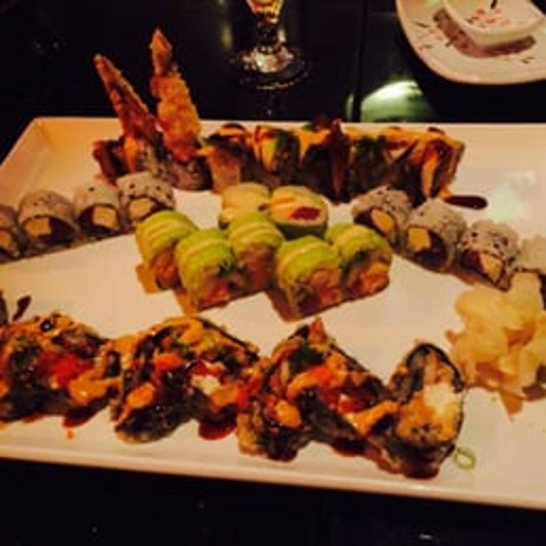 Shrimp tempura and cucumber inside, topped with avocado and eel sauce.