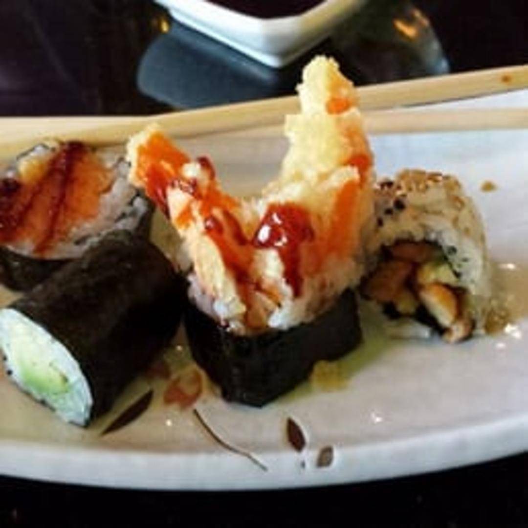 An assortment of vegetarian sushi rolls and nigiri featuring ingredients like avocado, cucumber, asparagus, inari (tofu pockets), and pickled radish.