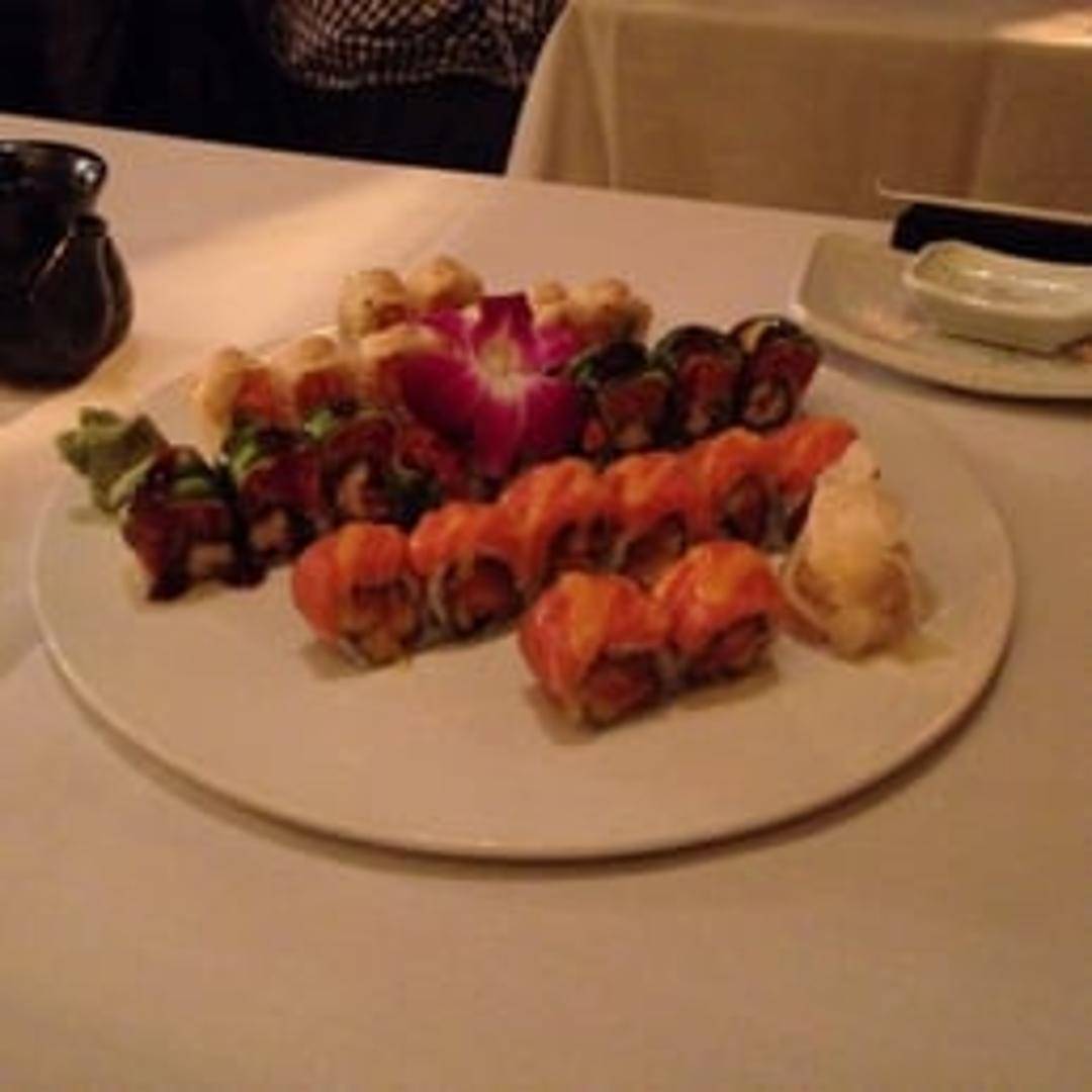 Tempura shrimp and avocado, topped with mango slices and a sweet sauce.