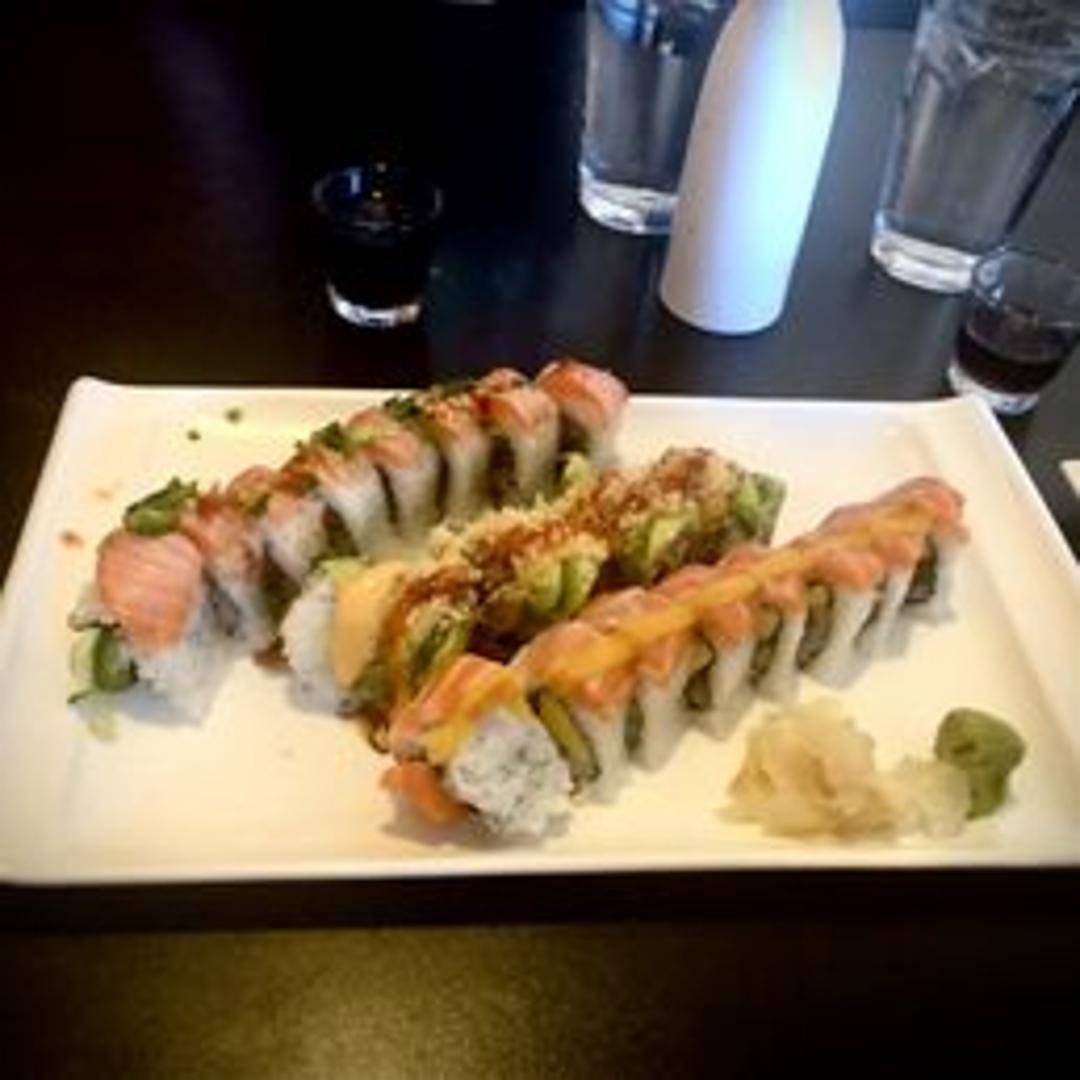 Salmon, avocado, and cucumber inside, topped with seared salmon, spicy mayo, and eel sauce.