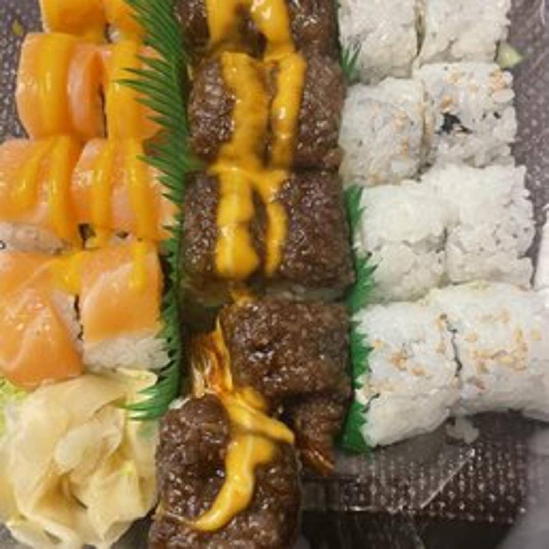 Shrimp tempura and cream cheese inside, topped with avocado, black tobiko, and eel sauce.