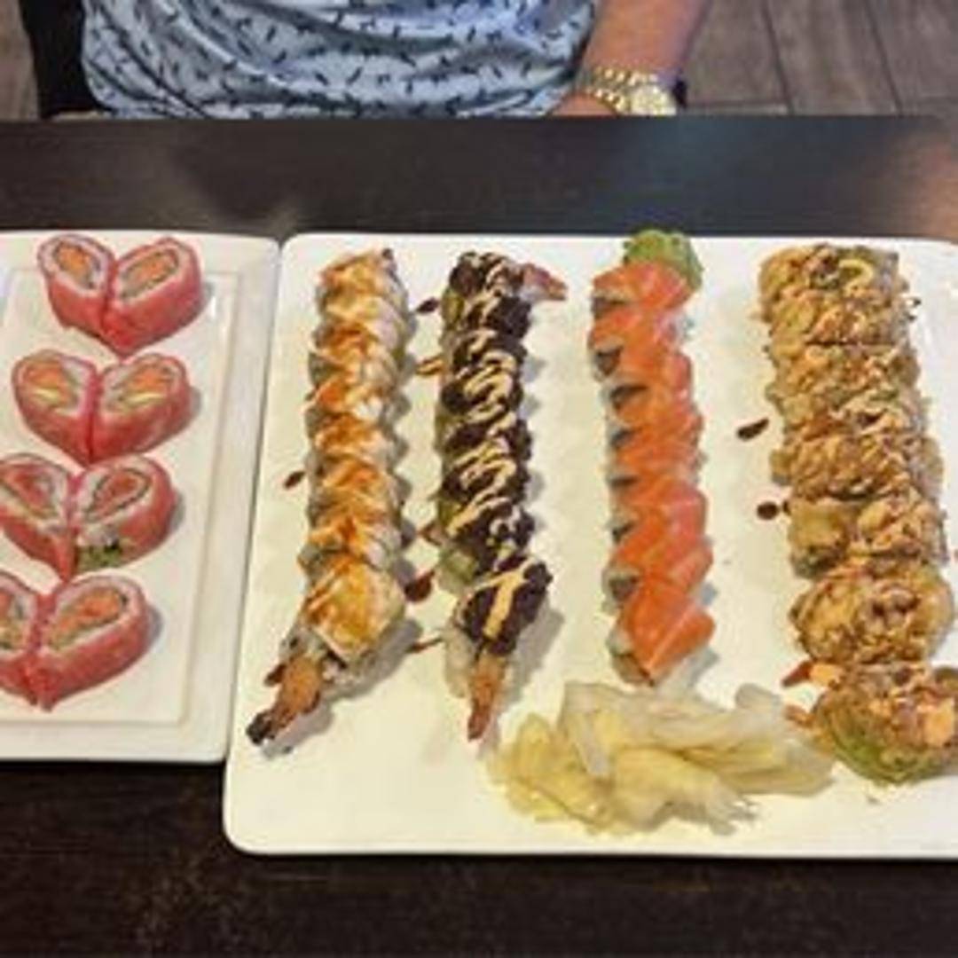 Shrimp tempura, cream cheese and avocado inside, wrapped with soy paper, topped with mango and mango sauce.