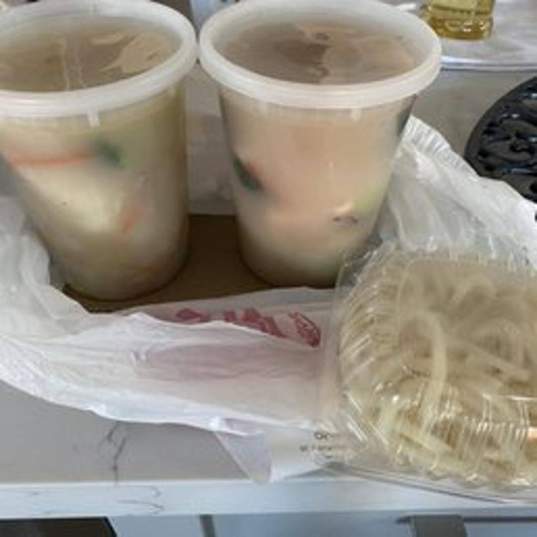 Thick, chewy udon noodles in a savory broth with tender pieces of chicken and vegetables. May contain scallions and nori.