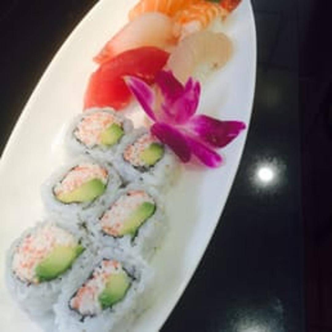 A selection of assorted nigiri and a California roll, served with miso soup and a small salad. The specific nigiri selection varies depending on availability and chef's choice.