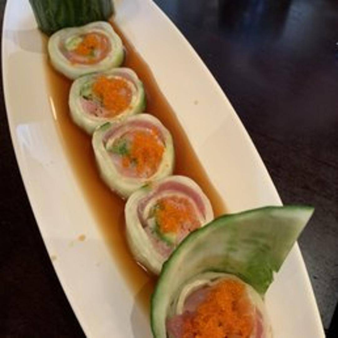 A sushi roll featuring fillings wrapped in a low-carbohydrate alternative to traditional rice. Specific ingredients vary but may include cucumber, avocado, fish (tuna, salmon, etc.), and vegetables, all carefully selected to minimize carbohydrate content. The roll is prepared with nori seaweed.