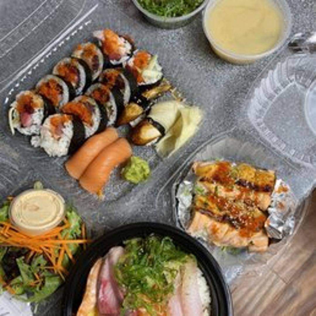 California roll topped with baked salmon, spicy mayo, eel sauce, and sesame seeds.