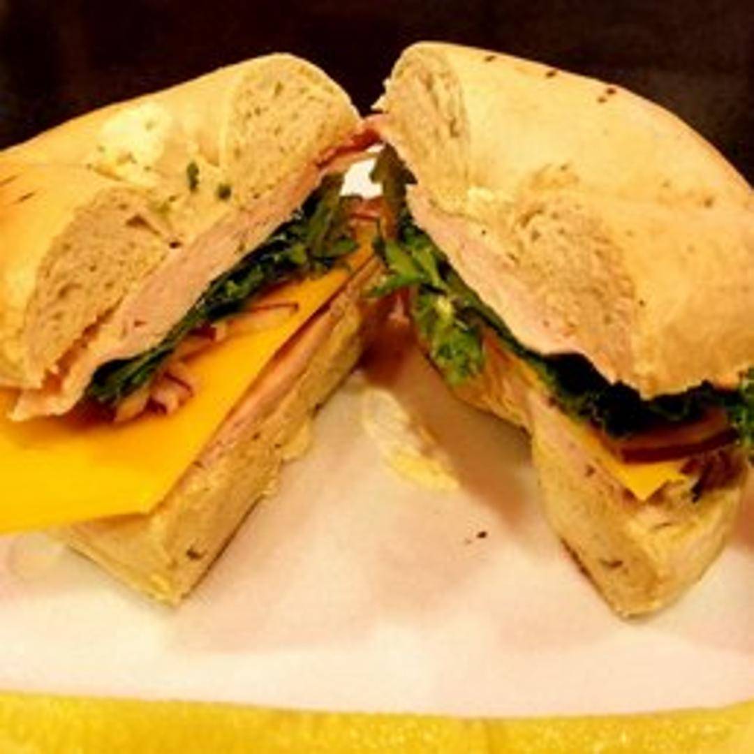 A hearty sandwich featuring savory smoked meat, cheese, and other delicious fillings, all nestled between a freshly baked bagel.