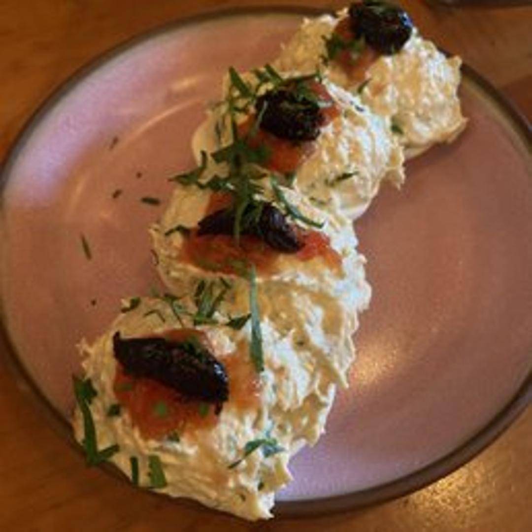 Classic deviled eggs with a Mediterranean twist. The creamy yolk filling is flavored with spices, herbs, and sometimes preserved lemon or other regional ingredients. Garnished artfully with paprika, herbs, or edible flowers.
