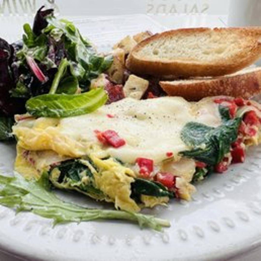Scrambled eggs with roasted vegetables, crumbled bacon, and cheddar cheese. Served with a side of toasted artisan bread.