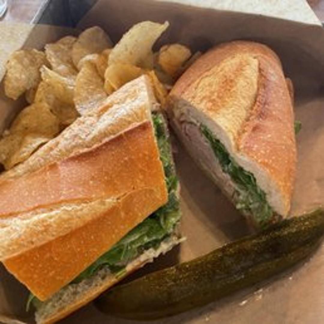 A Mediterranean-inspired sandwich featuring grilled chicken, roasted red peppers, spinach, feta cheese, and a lemon-herb aioli on toasted ciabatta bread.
