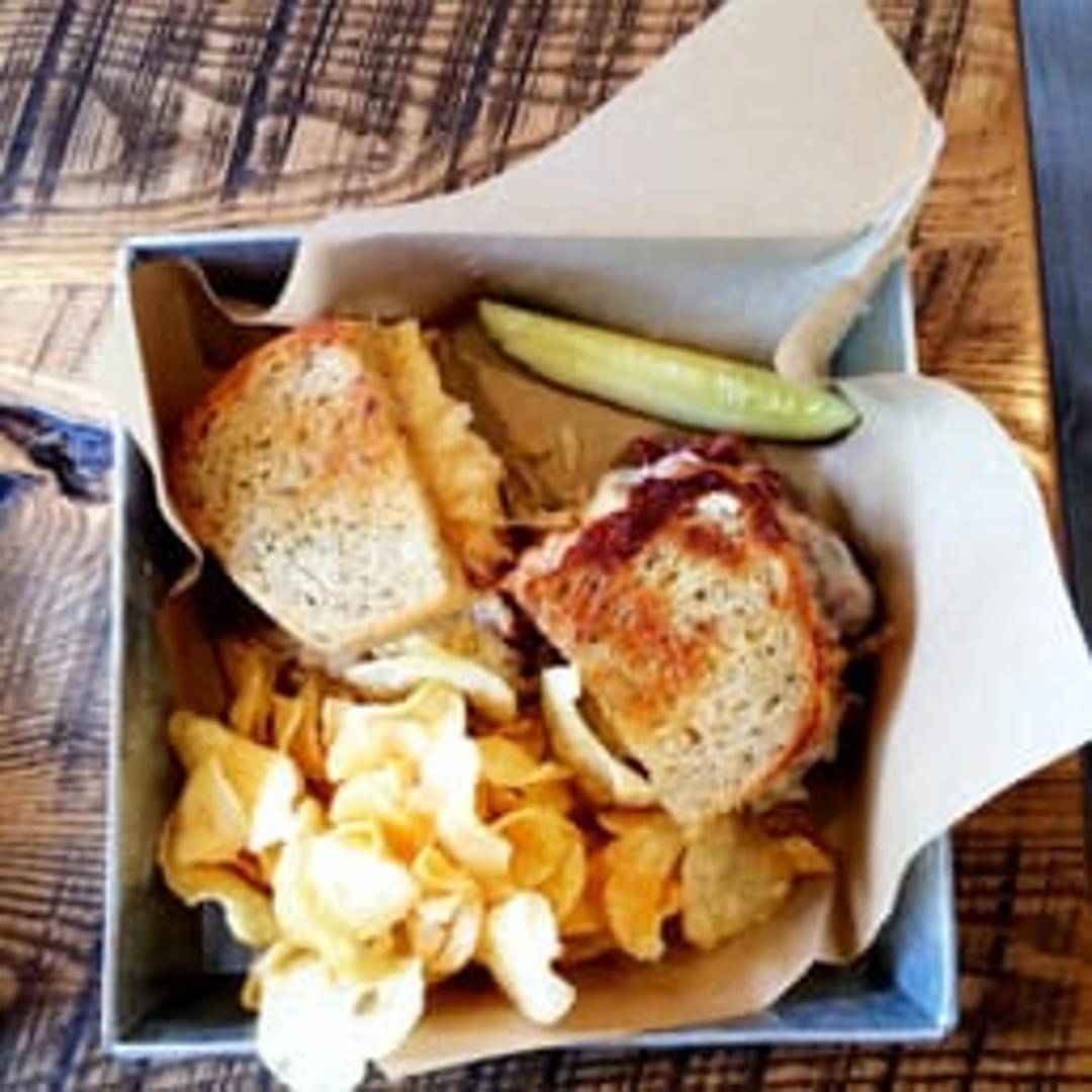 Thinly sliced corned beef, Swiss cheese, sauerkraut, and Russian dressing on grilled rye bread.