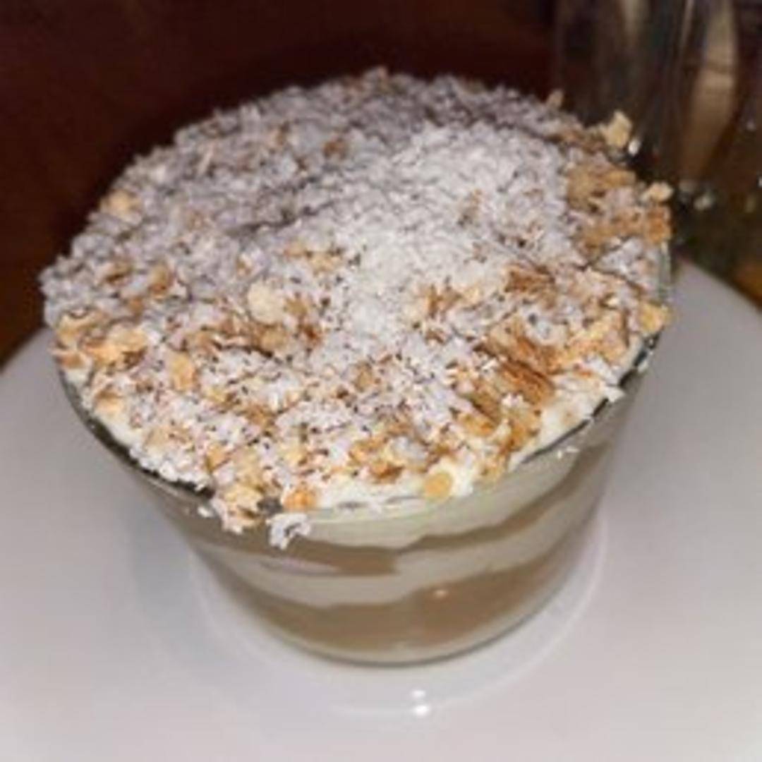 A delightful fusion of classic desserts, featuring layers of espresso-soaked ladyfingers, mascarpone cream, and a warm apple crisp topping with hints of cinnamon and spice.